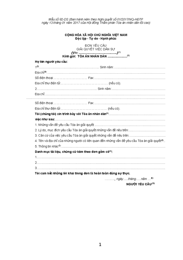 Đơn yêu cầu giải quyết việc dân sự theo Nghị quyết 01/2017/NQ-HĐTP (Mẫu số 92-DS)