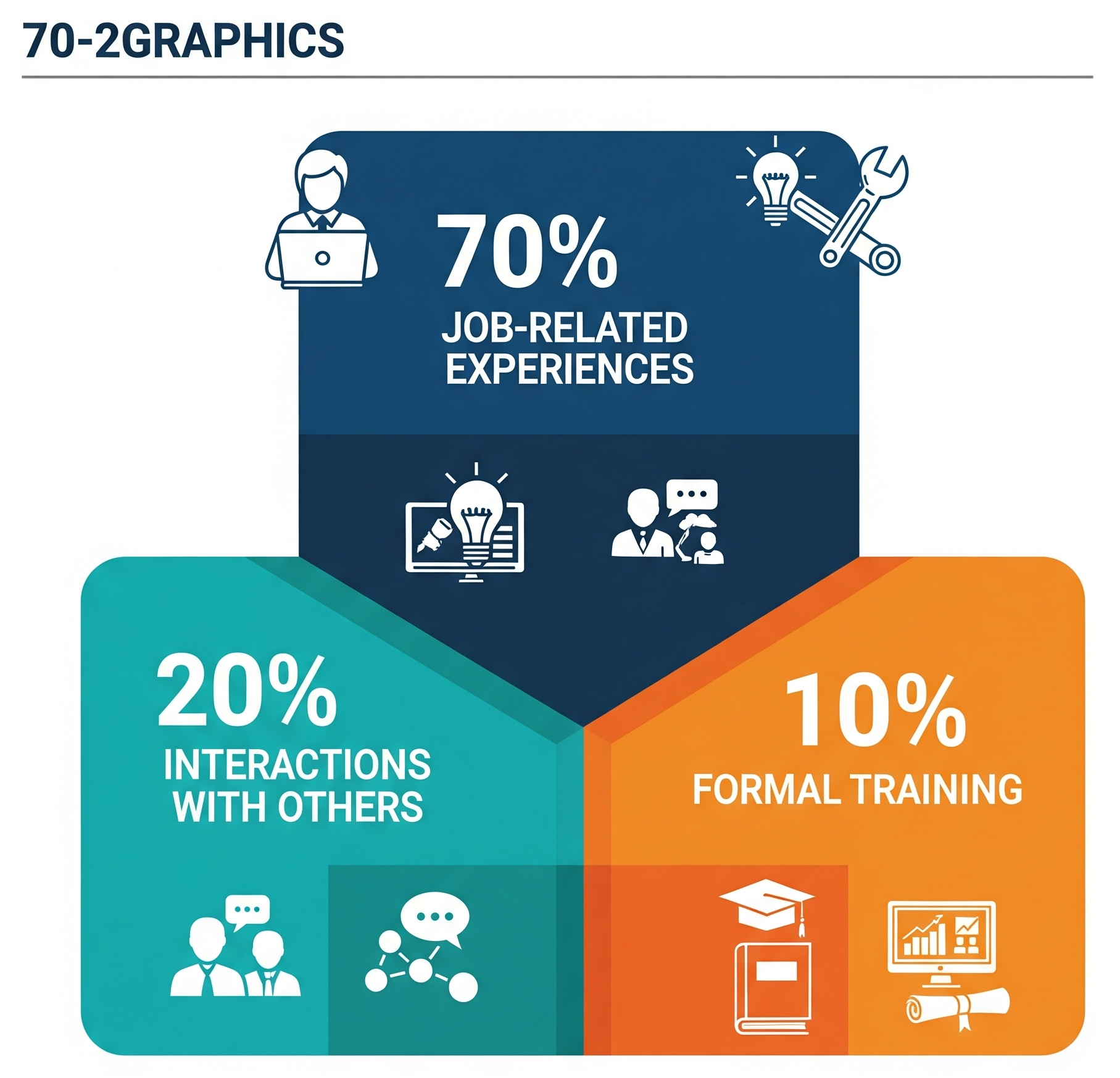 - 70% từ trải nghiệm công việc khẳng định rằng chính công việc hằng ngày là “trường học lớn nhất”, nơi mỗi người rèn luyện bản lĩnh, tư duy và năng lực thực tiễn.