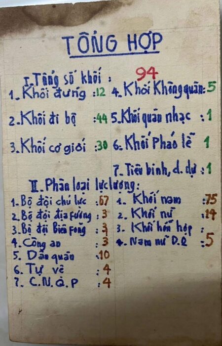 - Khối bộ binh và dân quân tự vệ: các đơn vị địa phương như Củ Chi, Bến Tre, dân quân dân tộc thiểu số, dân quân Thủ đô.